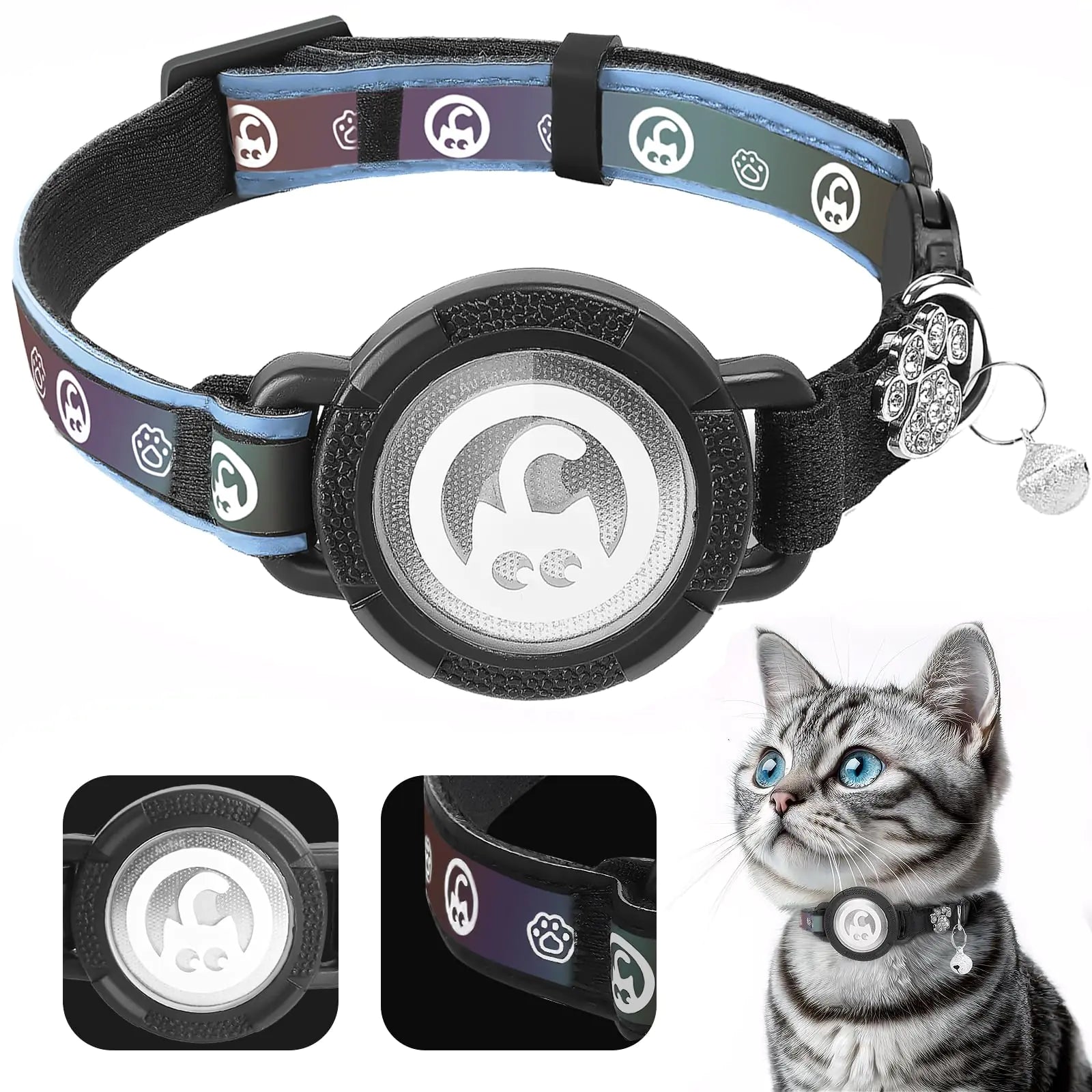 [Safety First: Airtag cat collar features an elastic band ensuring your cat can quickly escape if something gets caught around cat neck. With breakaway buckle and reflective rainbow colors your kitty can conquer nighttime adventures and you can have peace of mind knowing they’re safe and stylish Designed for Apple Airtag: Unlike other separated cat collar Airtag holder this integrated AirTag cat collar is perfectly designed to fit your AirTag securely protecting your Airtag and preventing it from falling off or dangling. (AirTag is not included.) Comfortable and Lightweight: Made from waterproof microfiber and diving fabric this Airtag cat collar is as soft as a hug. Lightweight TPU cat collar AirTag holder won’t scratch your cat’s skin ensuring your feline friend feels comfortable even after long hours of wear Sparkling Style: Let your cat show off with a airtag collar cat that’s as fashionable as they are! Featuring adorable patterns sparkling diamond metal paw and bells cat collar Airtag holder is the ultimate blend of style and function perfect for making a statement "Easy to Fit: Cat airtag collar also comes with a dust-proof and scratch-resistant cover to keep the AirTag safe while your pet stays secure. Available in 2 sizes (XS: 7-9 S: 9-13) AirTag cat collar is ideal for cats kittens puppies and small dogs ensuring a perfect fit for your furry companion"]
